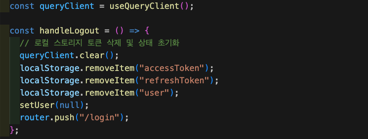 단순히 브라우저 저장소만 비우는 것으로는 부족했습니다. 로그아웃 버튼 클릭 시 queryClient.clear()를 실행하여 메모리에 상주하던 모든 쿼리 캐시를 즉시 소각하도록 조치했습니다. 덕분에 사용자 전환 시 데이터가 섞이는 무결성 문제를 완벽하게 해결했습니다.